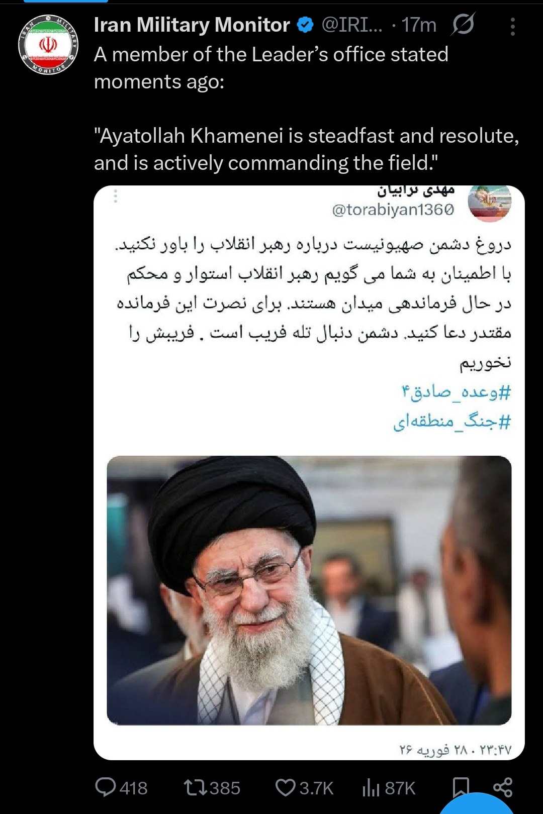 বাংলাদেশ সময় দিবাগত রাত ২:৩৫ মিনিটে এই বার্তা টুইট করে ইরান মিলিটারি মনিটর৷ তাদের দাবী অনুযায়ী এখনো জীবিত আছেন তাদের সর্বোচ্চ নেতা খামেনি৷ বিশ্ববাসীর কাছে তারা আহ্বান করেন গুজবে কান নিয়ে সতর্ক থাকার৷